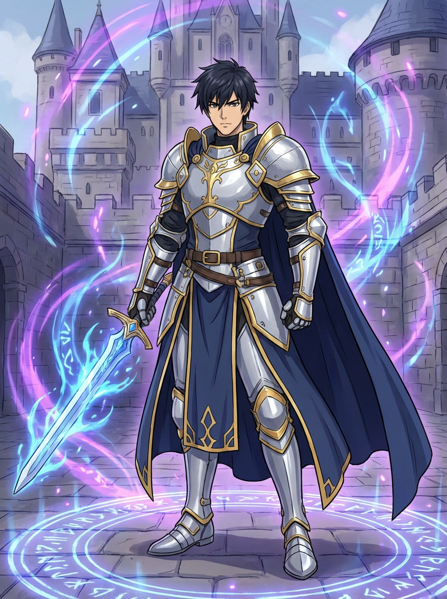 A fantasy anime warrior avatar, dressed in a legendary knight armor with a majestic cape and glowing sword. The setting is a grand castle with mystical energy radiating. the style is in anime illustration.
