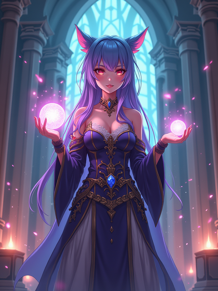 A fantasy anime warrior avatar, dressed in a magical sorceress outfit with glowing orbs and enchanted symbols . The setting is a grand castle with mystical energy radiating. the style is in anime illustration.