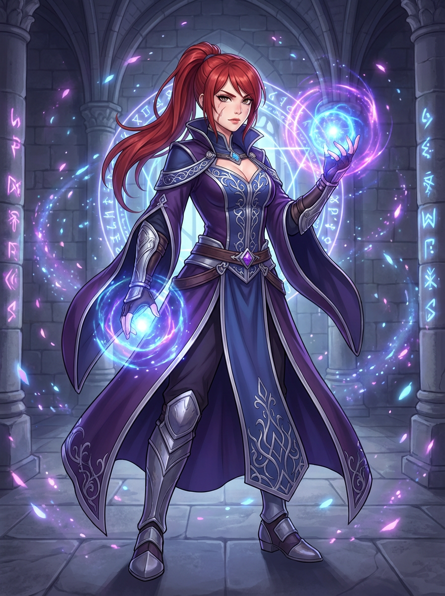 A fantasy anime warrior avatar, dressed in a magical sorceress outfit with glowing orbs and enchanted symbols . The setting is a grand castle with mystical energy radiating. the style is in anime illustration.