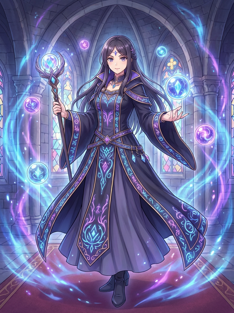 A fantasy anime warrior avatar, dressed in a magical sorceress outfit with glowing orbs and enchanted symbols . The setting is a grand castle with mystical energy radiating. the style is in anime illustration.