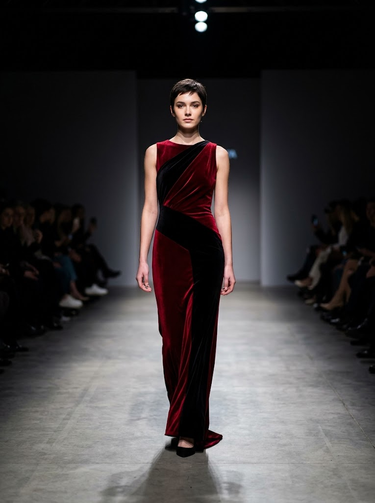 A fashion shot of a short dark-haired model wearing a crimson and obsidian gown, standing elegantly on a minimalist runway with dramatic shadows and high contrast lighting, during an indoor evening fashion show, shot with a Canon EOS R5, 85mm f/1.2 lens, deep rich colors with sharp detailing