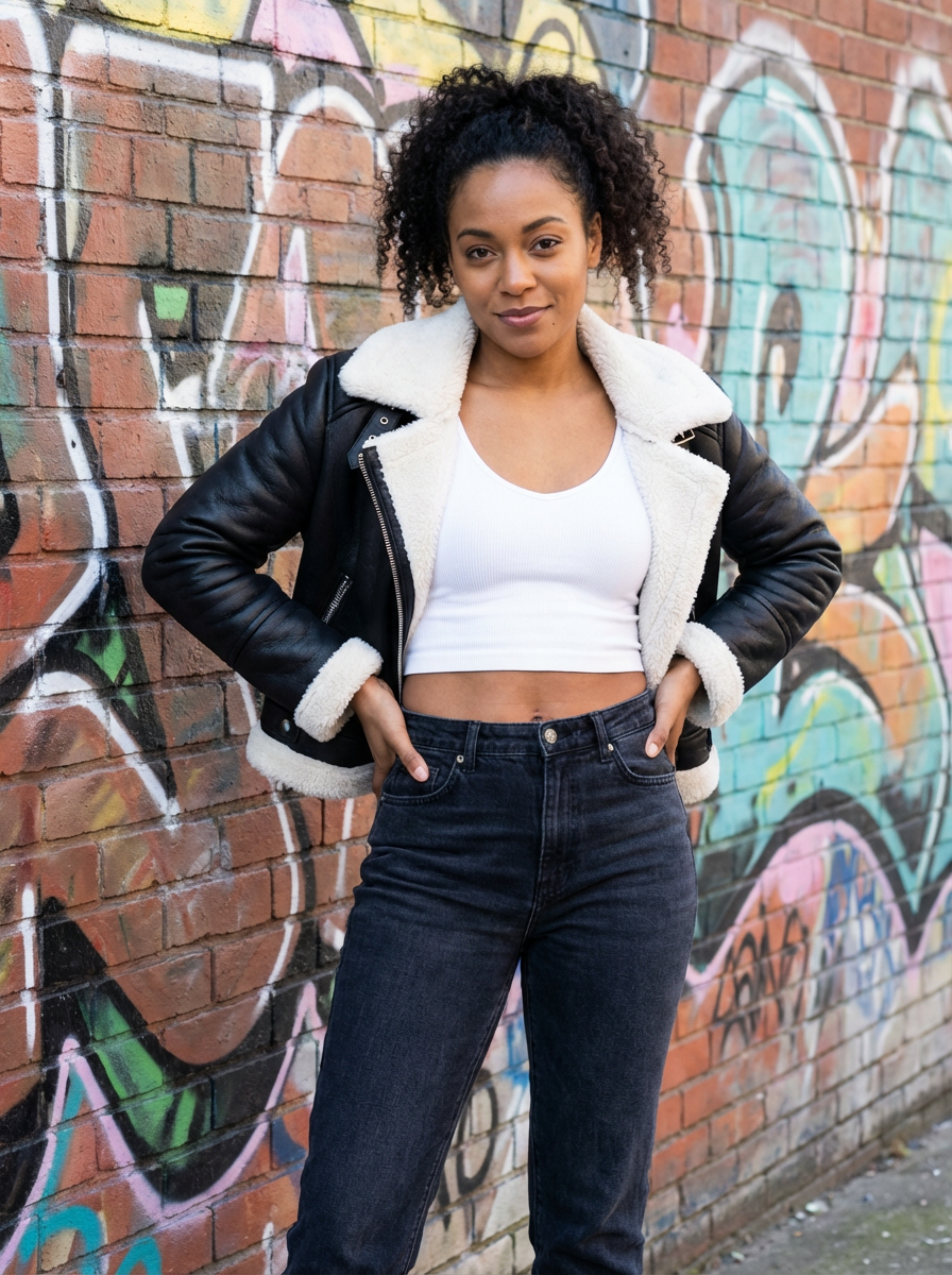 a fashionable feminine model posing in front of street art