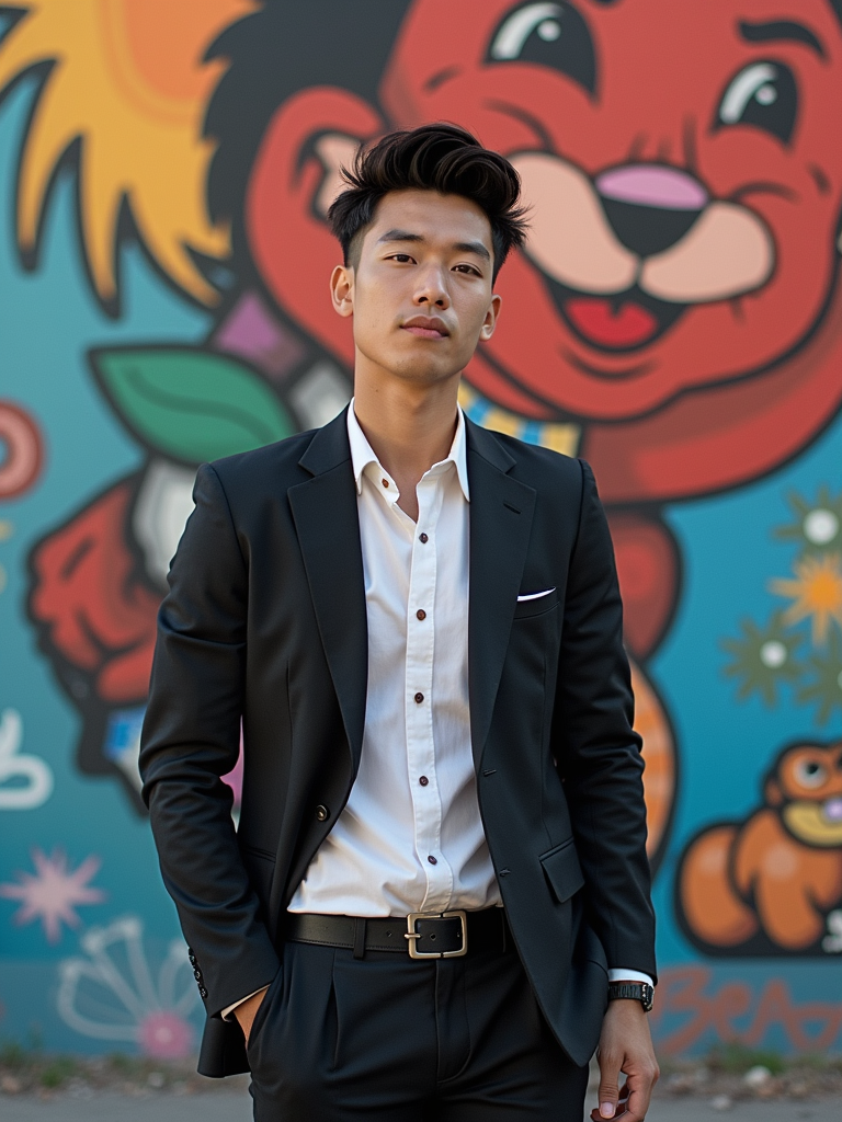 a fashionable masculine model posing in front of street art