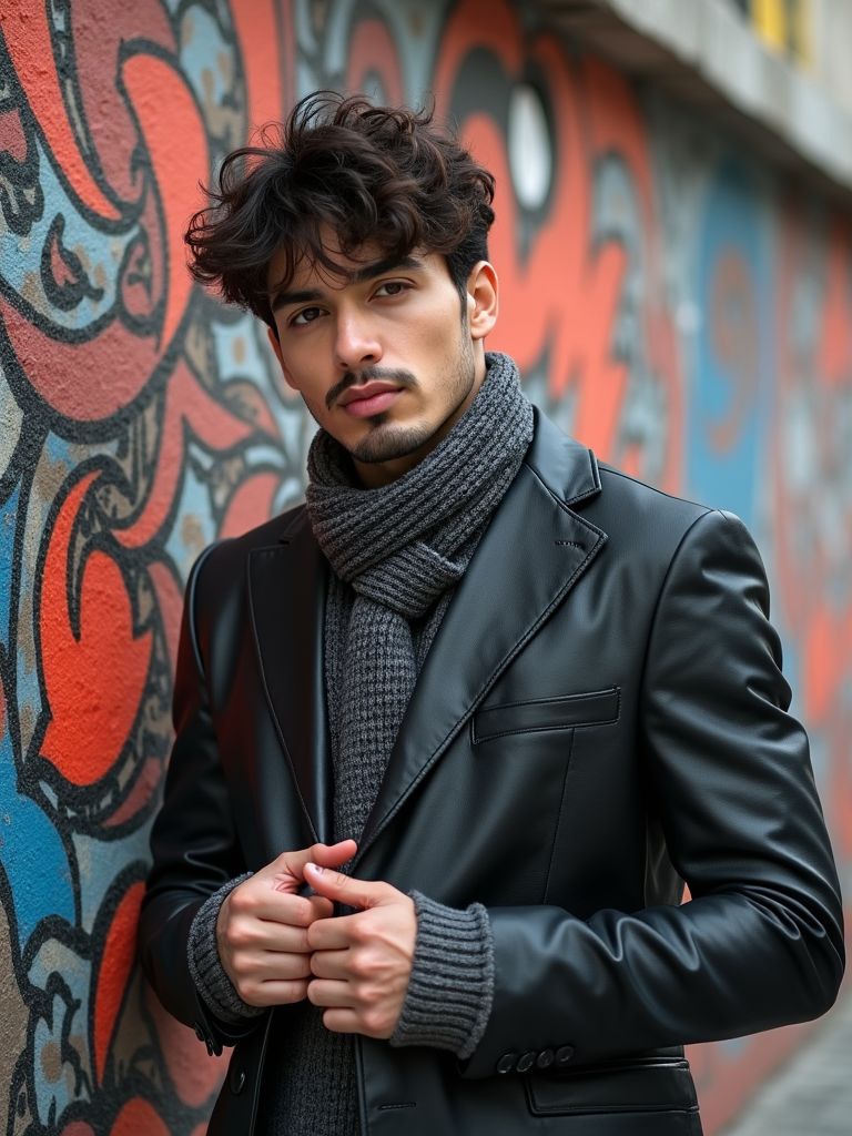a fashionable masculine model posing in front of street art