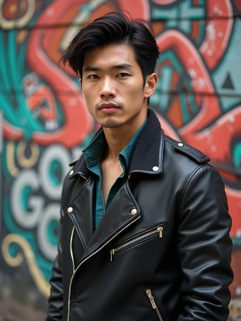 a fashionable masculine model posing in front of street art