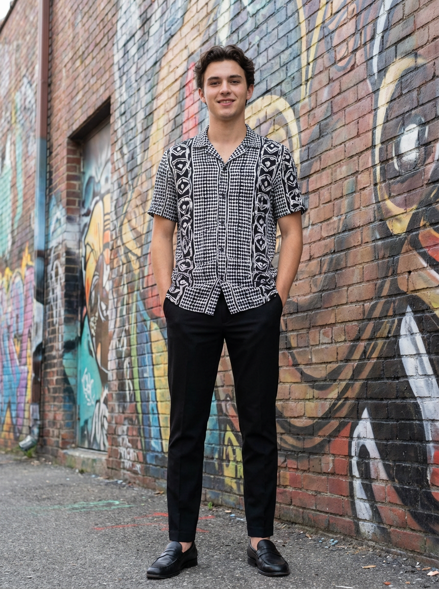 a fashionable masculine model posing in front of street art