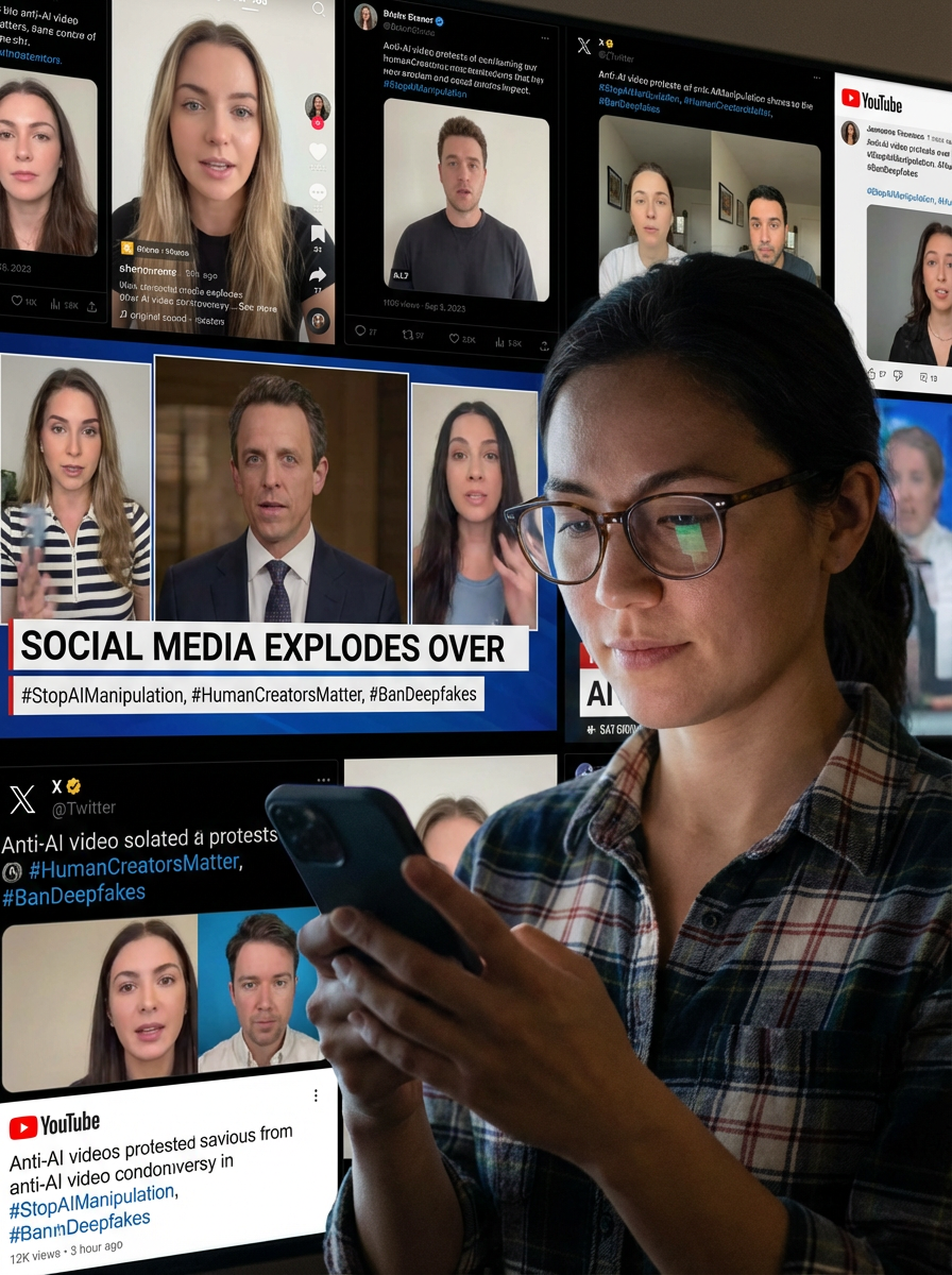 a fast-paced montage of tiktok, twitter, and youtube posts reacting to the anti-ai video protests. screens show influencers, journalists, and politicians debating ai-generated content. the chyron reads: 'social media explodes over ai video controversy.' viral hashtags appear on-screen: #stopaimanipulation, #humancreatorsmatter, #bandeepfakes