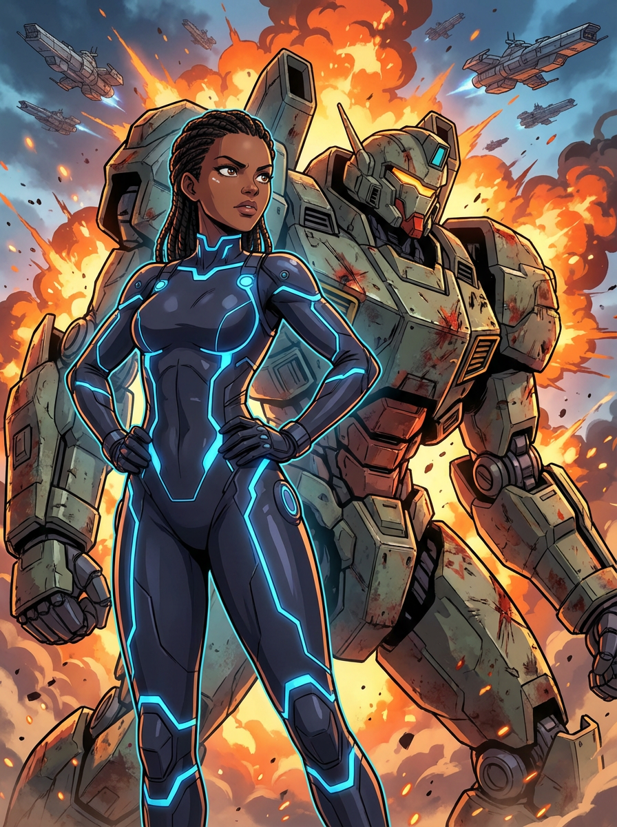 A fearless anime mecha pilot standing in front of a giant battle robot, preparing for an epic fight. The model wears a sleek, form-fitting pilot suit with glowing energy lines . The sky behind them is filled with explosions and sci-fi battleships flying in formation. The style is in anime illustration.