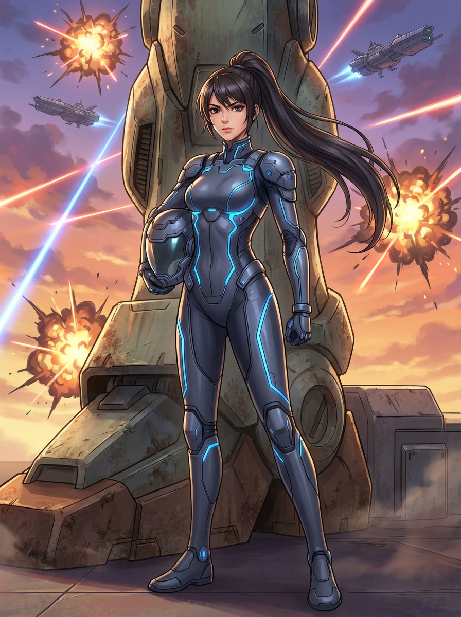 A fearless anime mecha pilot standing in front of a giant battle robot, preparing for an epic fight. The model wears a sleek, form-fitting pilot suit with glowing energy lines . The sky behind them is filled with explosions and sci-fi battleships flying in formation. The style is in anime illustration.
