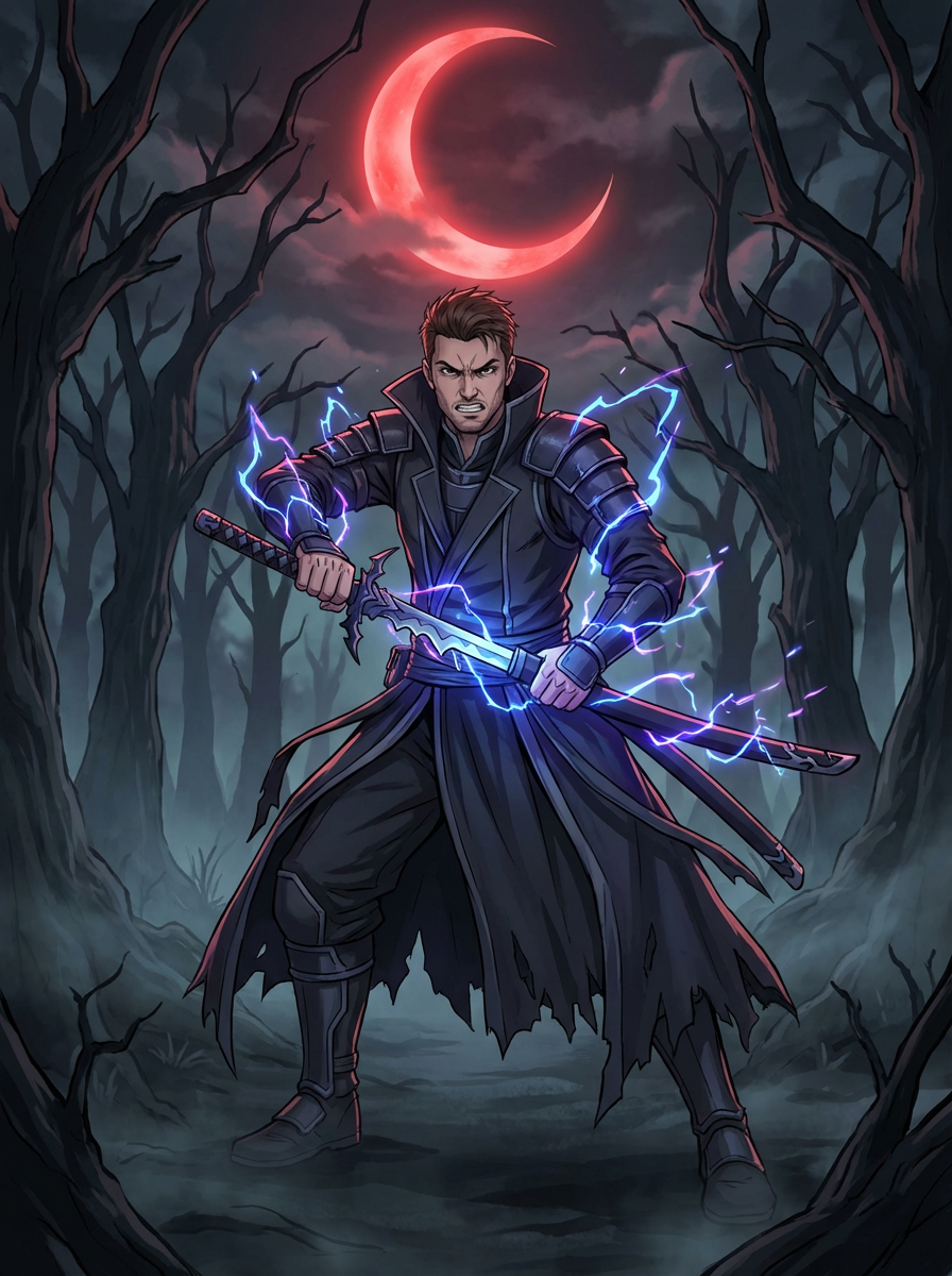 A fierce anime warrior with glowing demon-slaying energy, wielding a uniquely designed katana. The model wears a dark warrior's robe with a high collar, standing in a battle-ready stance. The background is an eerie forest with a glowing red moon. The style is in anime illustration.