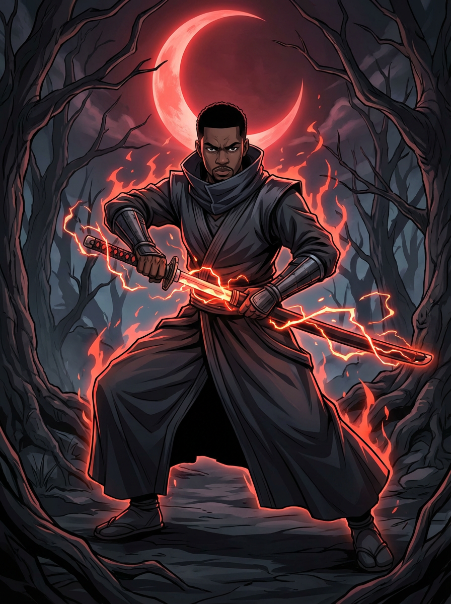 A fierce anime warrior with glowing demon-slaying energy, wielding a uniquely designed katana. The model wears a dark warrior's robe with a high collar, standing in a battle-ready stance. The background is an eerie forest with a glowing red moon. The style is in anime illustration.