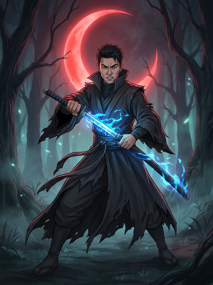 A fierce anime warrior with glowing demon-slaying energy, wielding a uniquely designed katana. The model wears a dark warrior's robe with a high collar, standing in a battle-ready stance. The background is an eerie forest with a glowing red moon. The style is in anime illustration.