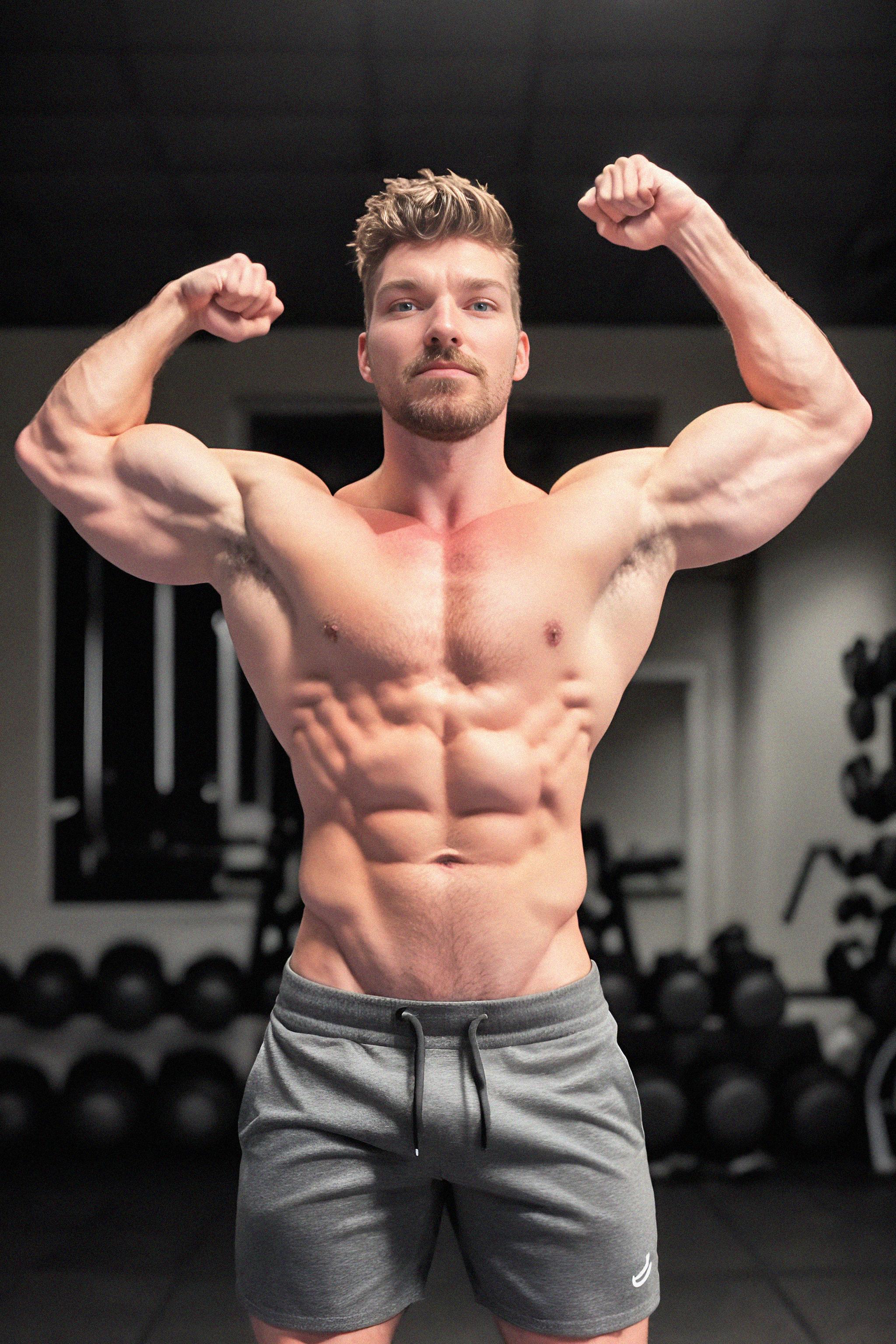 a fit male model as fitness influencer flexing their muscles in the gym, capturing the sculpted physique and hard work