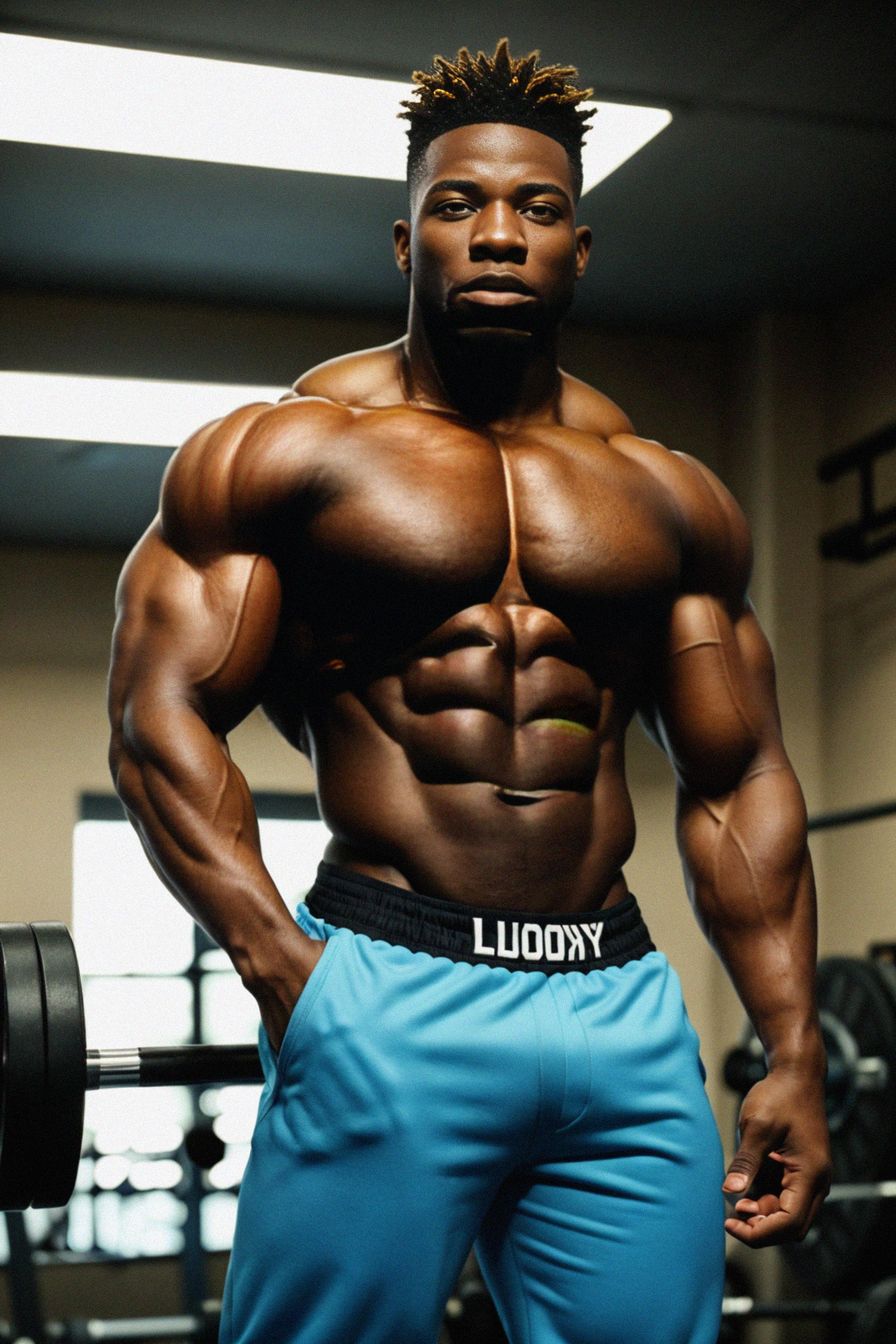 a fit male model as fitness influencer wearing posing trunks in the bodybuilding gym, showcasing an impressive physique and bulging muscles