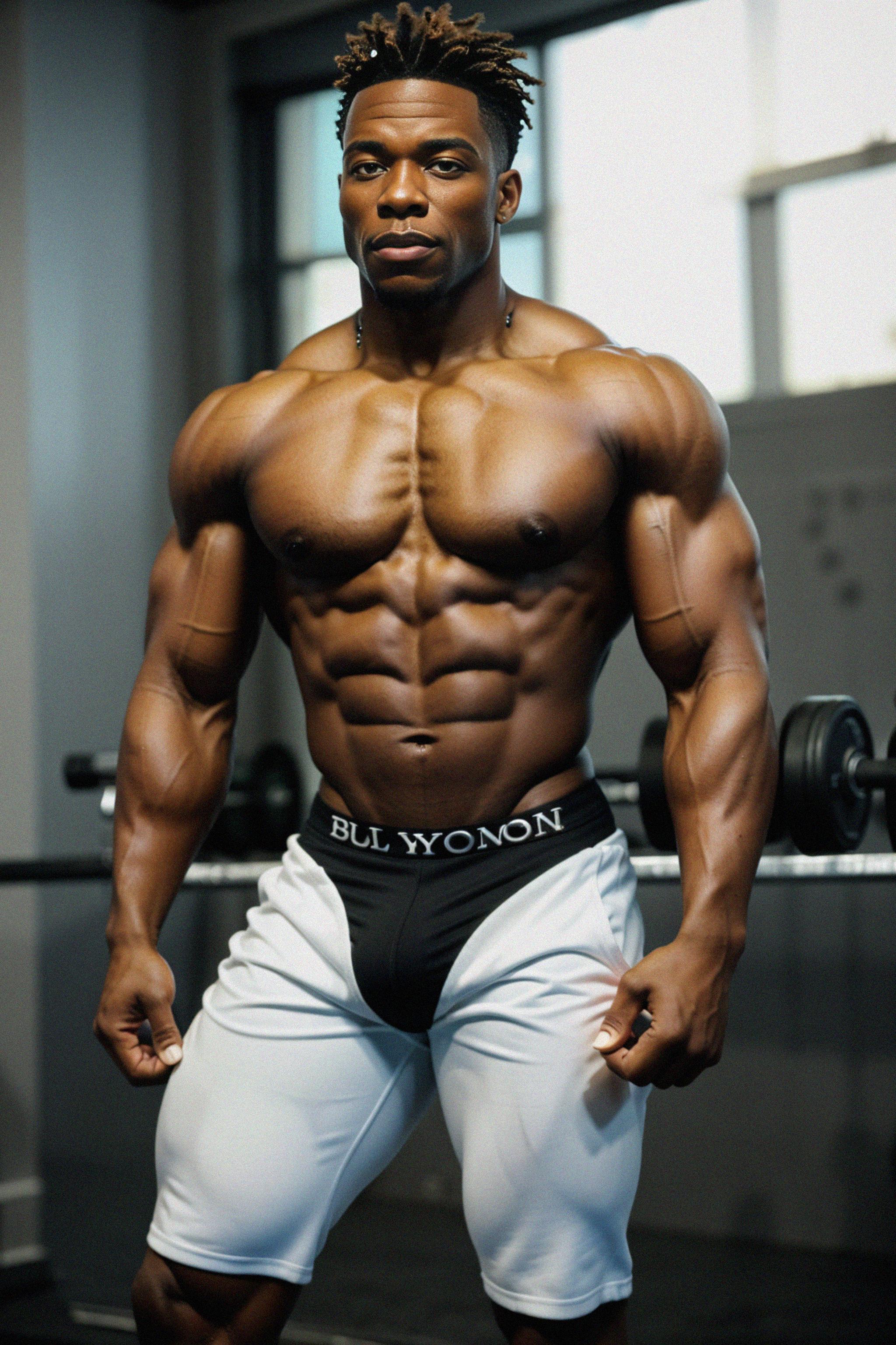 a fit male model as fitness influencer wearing posing trunks in the bodybuilding gym, showcasing an impressive physique and bulging muscles