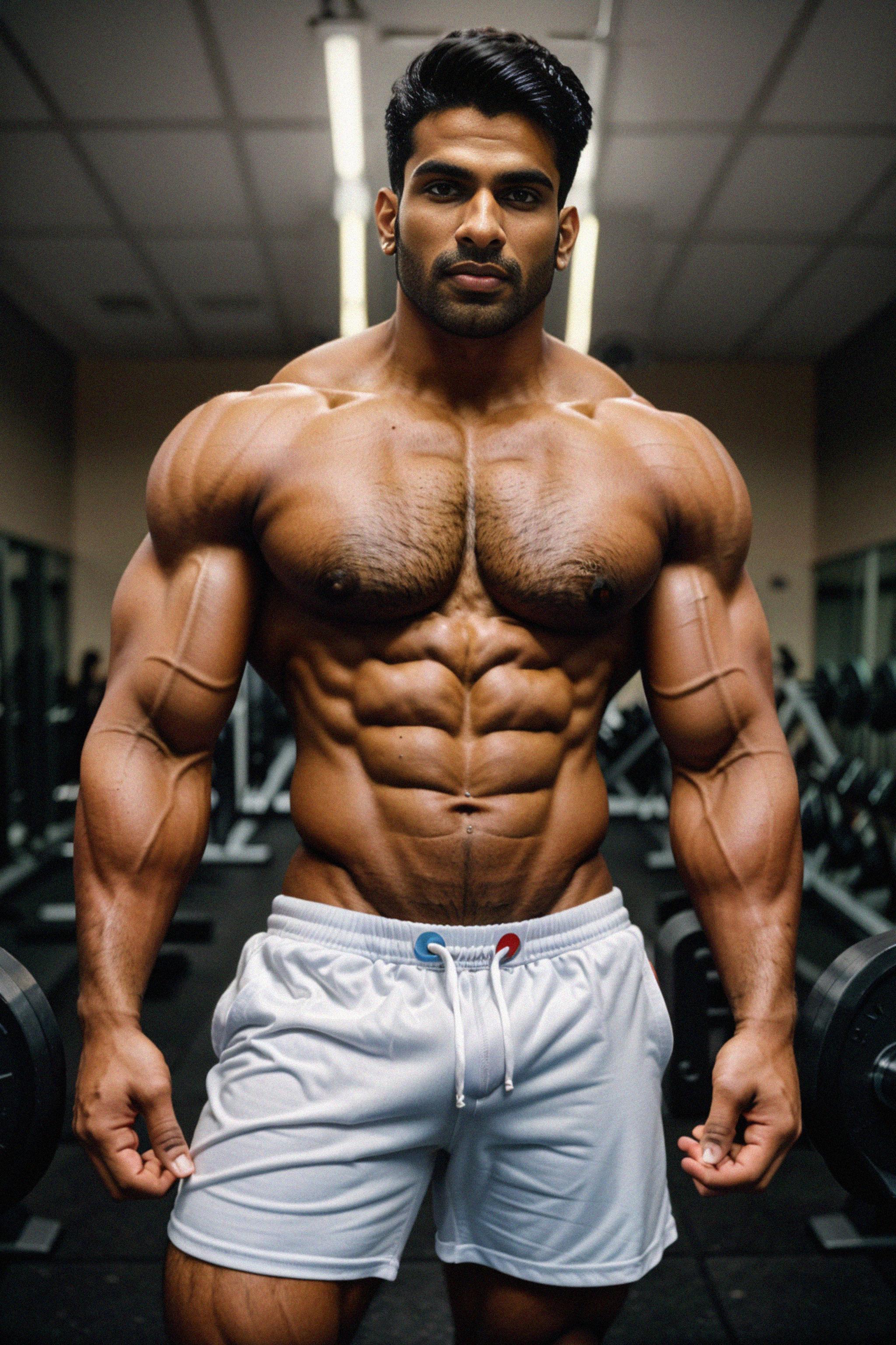 a fit male model as fitness influencer wearing posing trunks in the bodybuilding gym, showcasing an impressive physique and bulging muscles