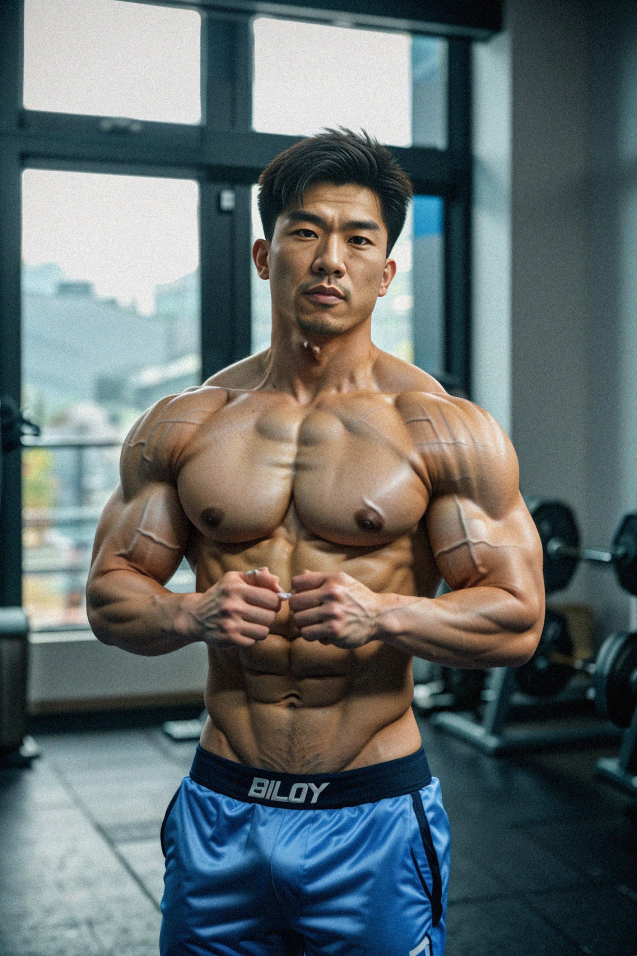 a fit male model as fitness influencer wearing posing trunks in the bodybuilding gym, showcasing an impressive physique and bulging muscles