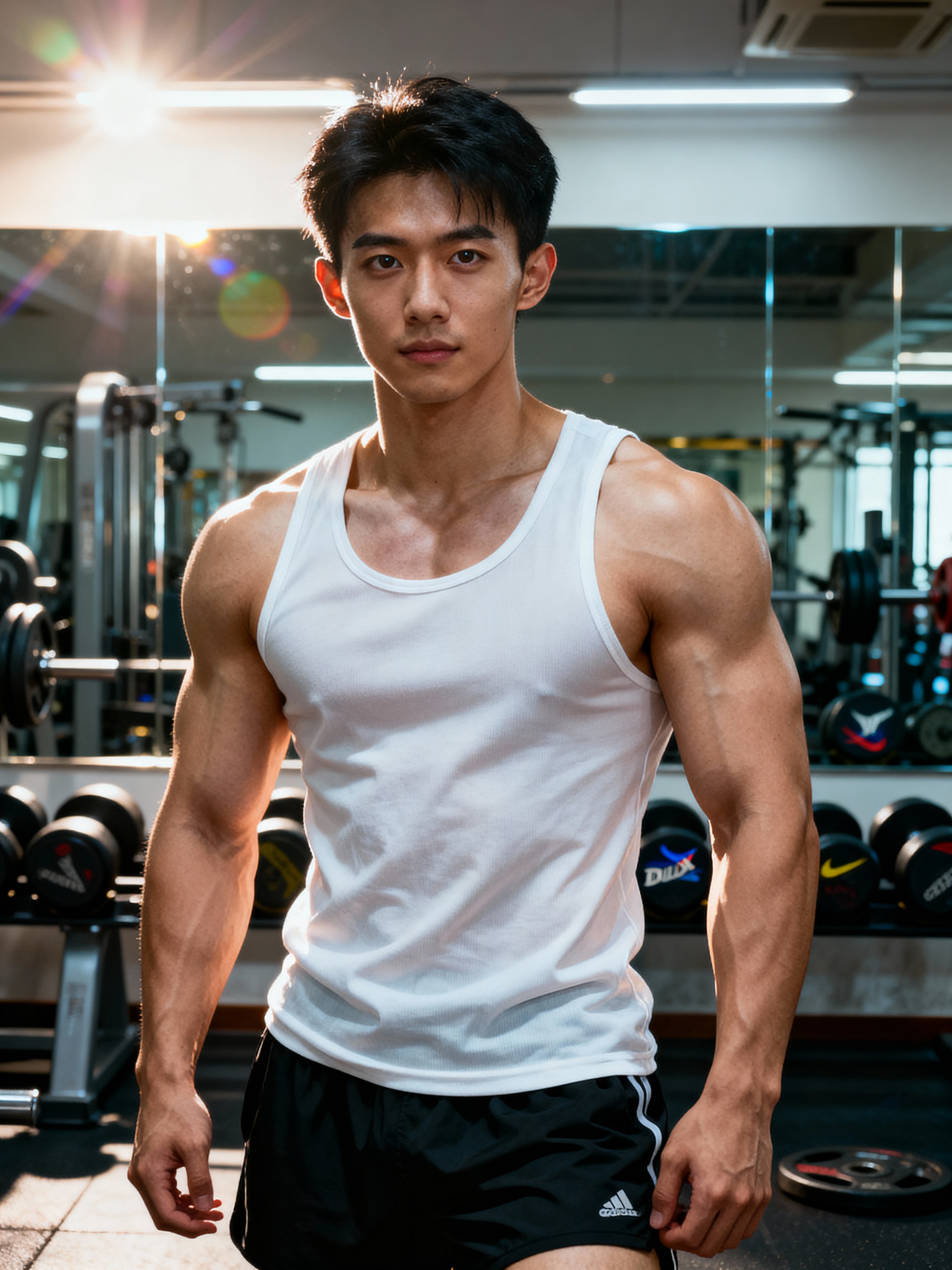 a fit model as fitness influencer wearing tank top and gym shorts in the bodybuilding gym
