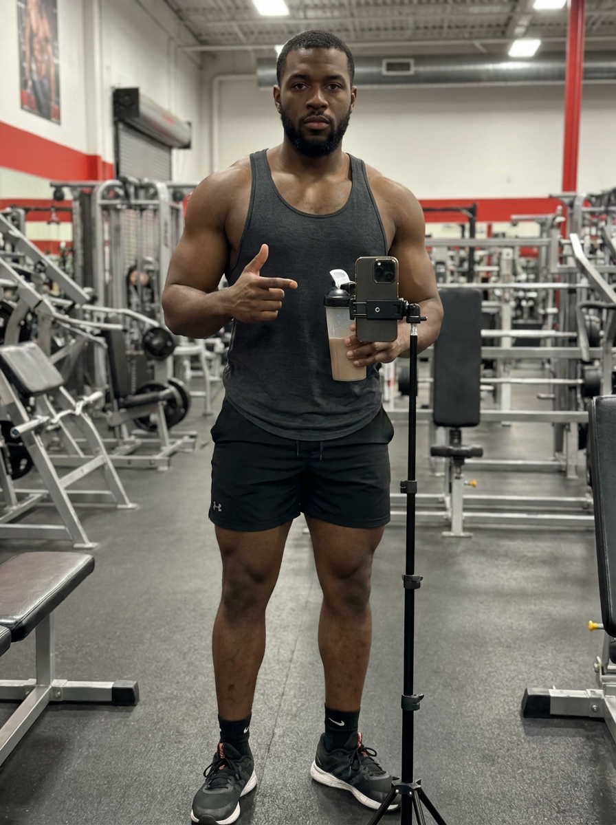 a fit model as fitness influencer wearing tank top and gym shorts in the bodybuilding gym