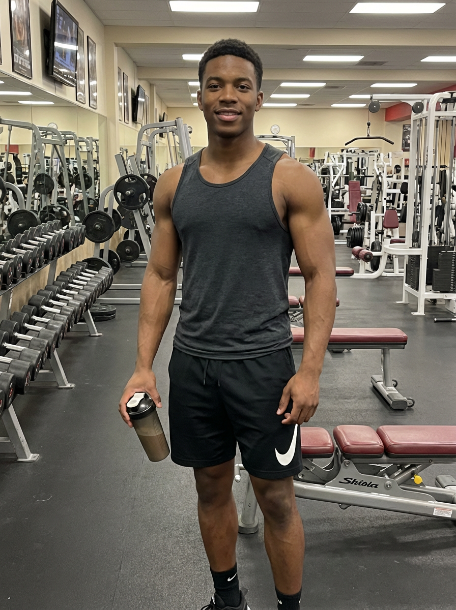 a fit model as fitness influencer wearing tank top and gym shorts in the bodybuilding gym