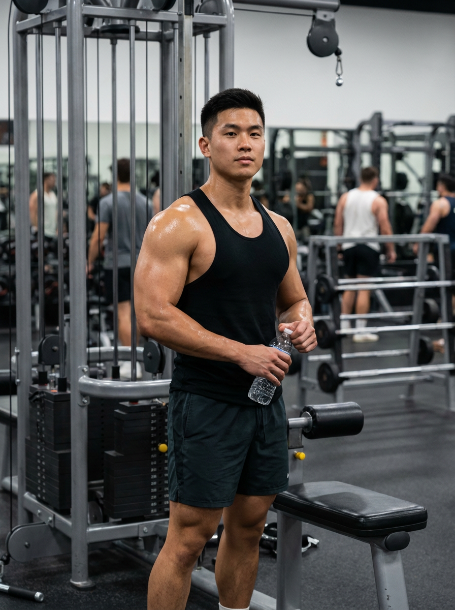 a fit model as fitness influencer wearing tank top and gym shorts in the bodybuilding gym