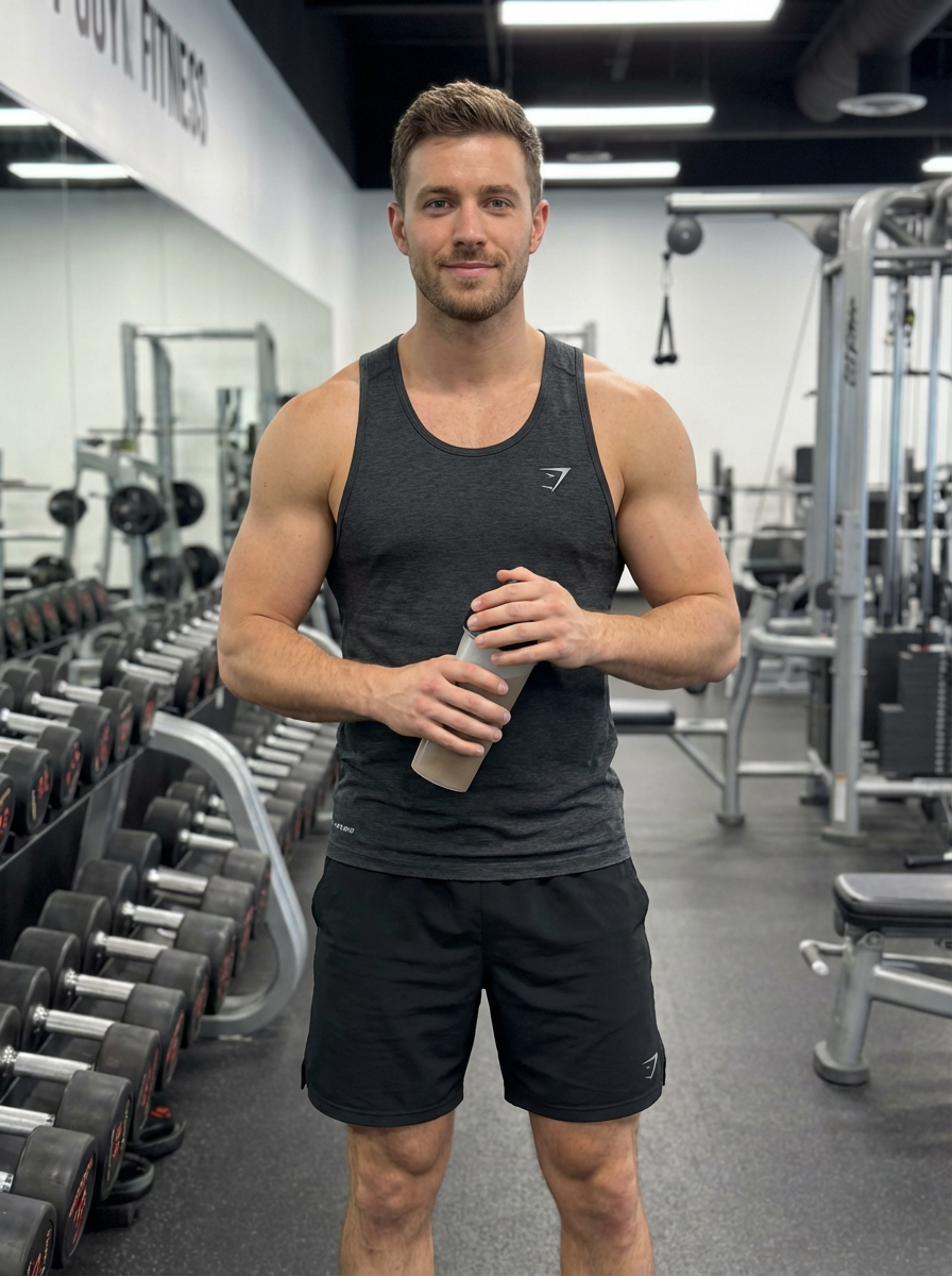 a fit model as fitness influencer wearing tank top and gym shorts in the bodybuilding gym