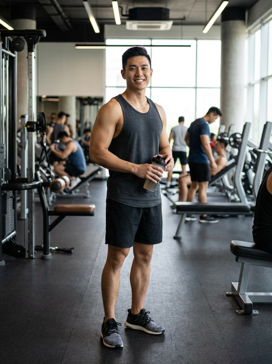 a fit model as fitness influencer wearing tank top and gym shorts in the bodybuilding gym