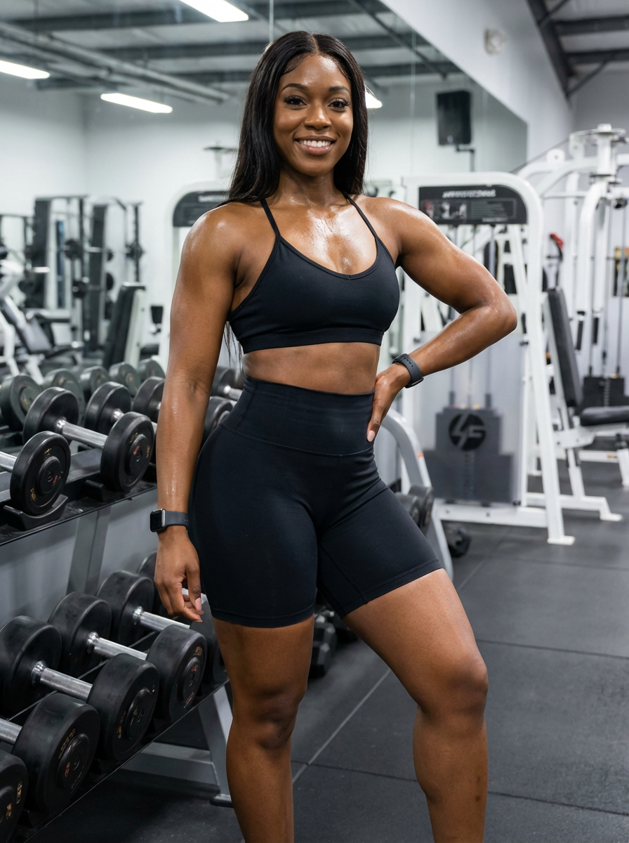 a fit model as fitness influencer wearing sports bra and leggings shorts in the bodybuilding gym