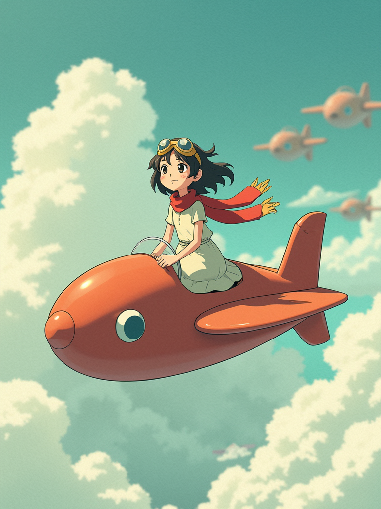 A gentle line art anime-inspired portrait aboard a flying machine, the character wearing a simple dress with goggles and a scarf , soaring through clouds. The sky is filled with fantastic flying contraptions. The style is adventurous like a line art anime film.