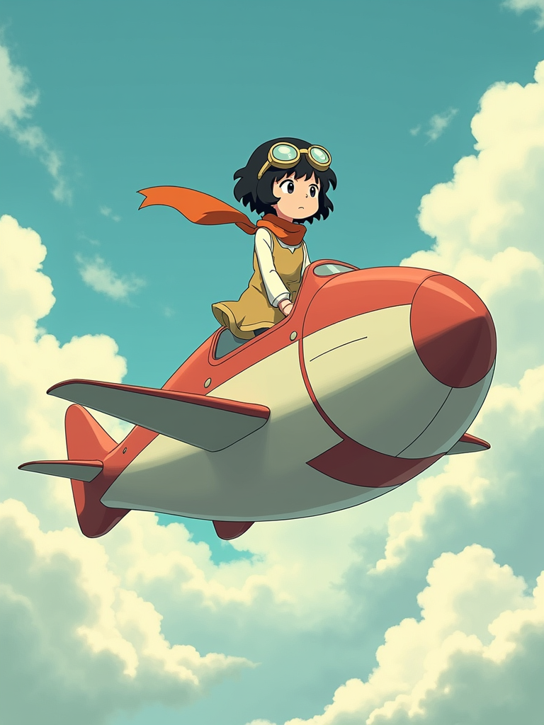 A gentle line art anime-inspired portrait aboard a flying machine, the character wearing a simple dress with goggles and a scarf , soaring through clouds. The sky is filled with fantastic flying contraptions. The style is adventurous like a line art anime film.