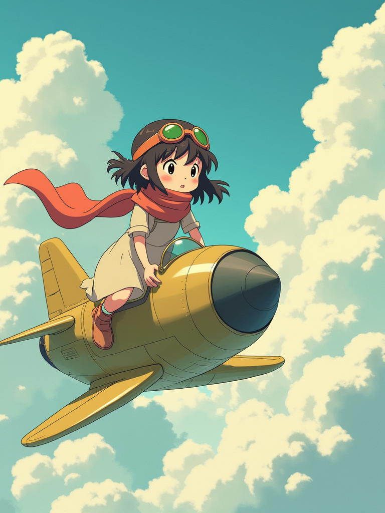 A gentle line art anime-inspired portrait aboard a flying machine, the character wearing a simple dress with goggles and a scarf , soaring through clouds. The sky is filled with fantastic flying contraptions. The style is adventurous like a line art anime film.