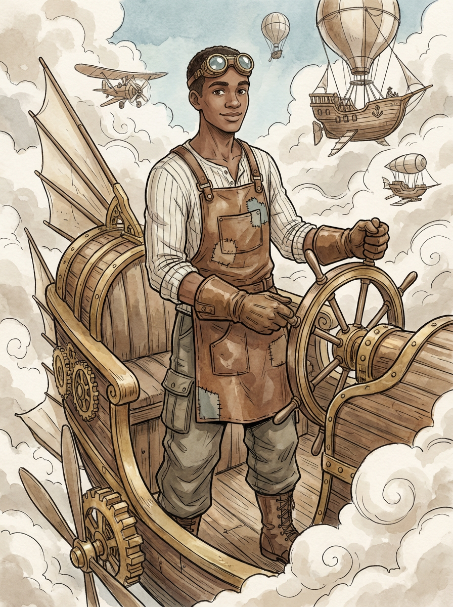 A gentle line art anime portrait aboard a flying machine, with model as the character wearing an inventor's outfit with leather gloves, soaring through clouds. The sky is filled with fantastic flying contraptions. The style is adventurous.