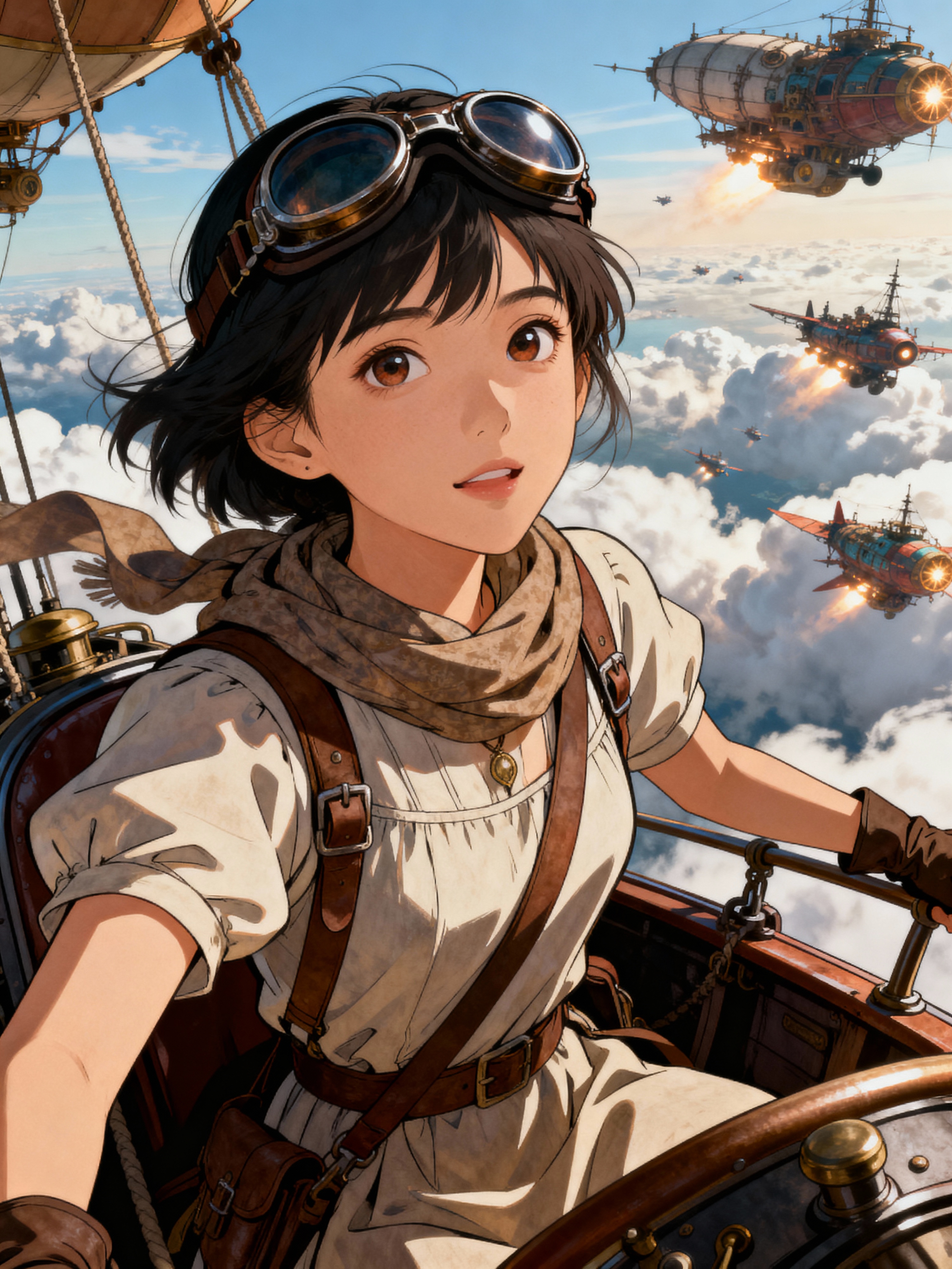 A gentle line art anime portrait aboard a flying machine, with model as the character wearing a simple dress with goggles and a scarf , soaring through clouds. The sky is filled with fantastic flying contraptions. The style is adventurous.