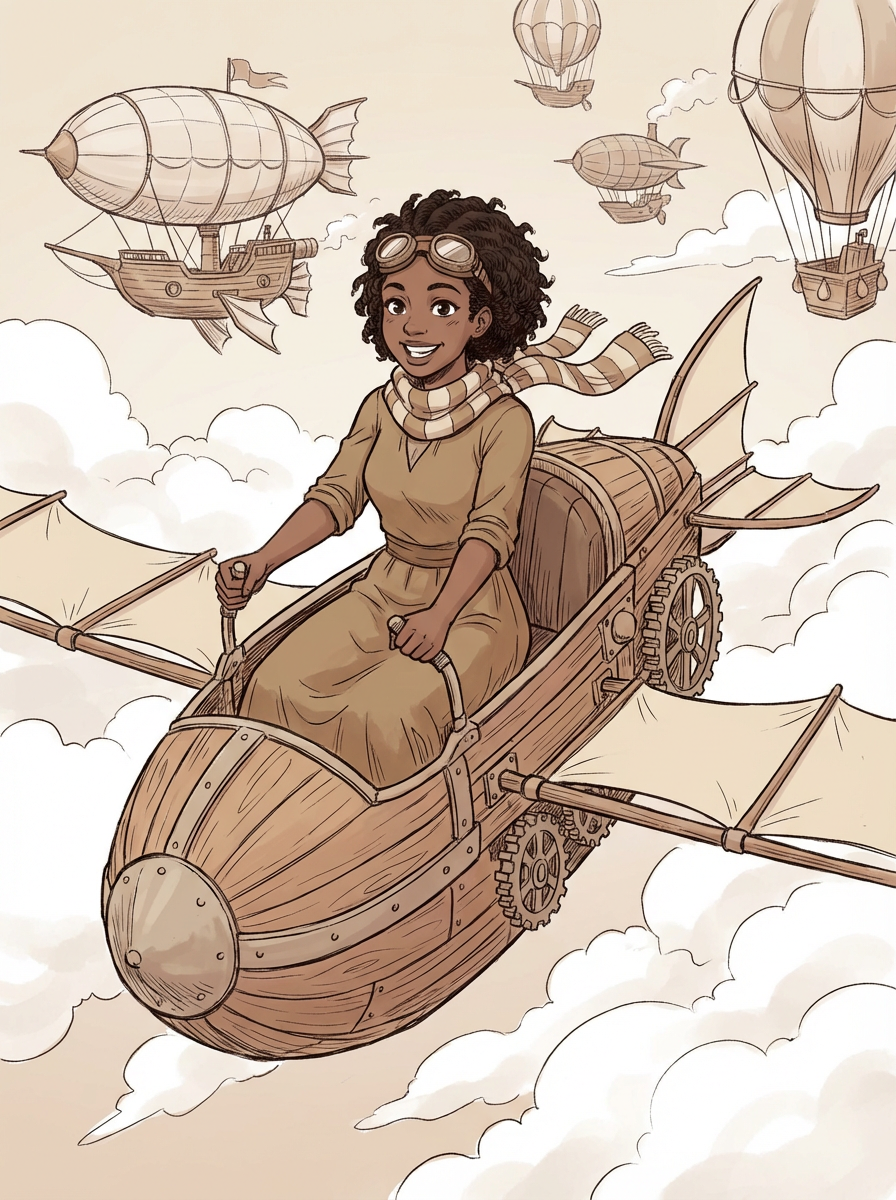 A gentle line art anime portrait aboard a flying machine, with model as the character wearing a simple dress with goggles and a scarf , soaring through clouds. The sky is filled with fantastic flying contraptions. The style is adventurous.