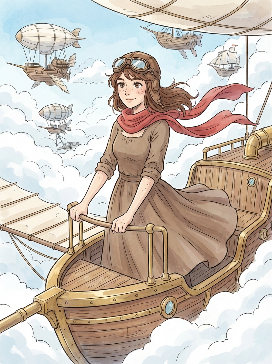 A gentle line art anime portrait aboard a flying machine, with model as the character wearing a simple dress with goggles and a scarf , soaring through clouds. The sky is filled with fantastic flying contraptions. The style is adventurous.