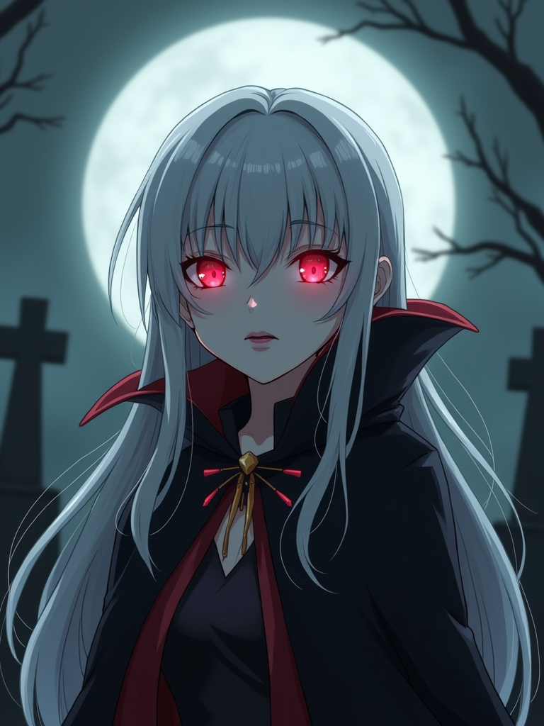 A gothic anime vampire avatar, with pale skin and piercing red eyes, wearing a dark vampire cloak with a high collar and long silver hair. The setting is a foggy moonlit graveyard.