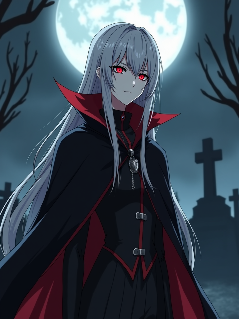 A gothic anime vampire avatar, with pale skin and piercing red eyes, wearing a dark vampire cloak with a high collar and long silver hair. The setting is a foggy moonlit graveyard.