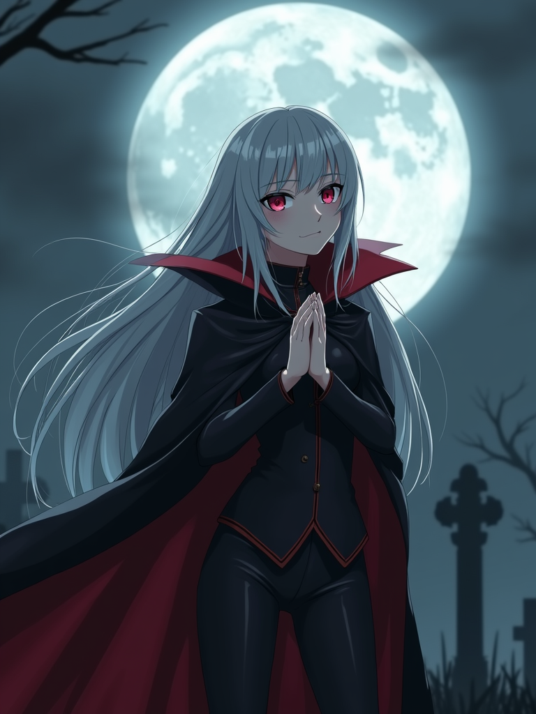 A gothic anime vampire avatar, with pale skin and piercing red eyes, wearing a dark vampire cloak with a high collar and long silver hair. The setting is a foggy moonlit graveyard.