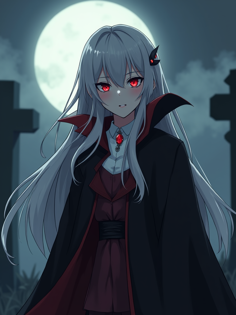A gothic anime vampire avatar, with pale skin and piercing red eyes, wearing a dark vampire cloak with a high collar and long silver hair. The setting is a foggy moonlit graveyard. the style is in anime illustration.