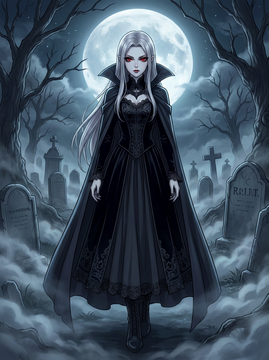 A gothic anime vampire avatar, with pale skin and piercing red eyes, wearing a dark vampire cloak with a high collar and long silver hair. The setting is a foggy moonlit graveyard. the style is in anime illustration.