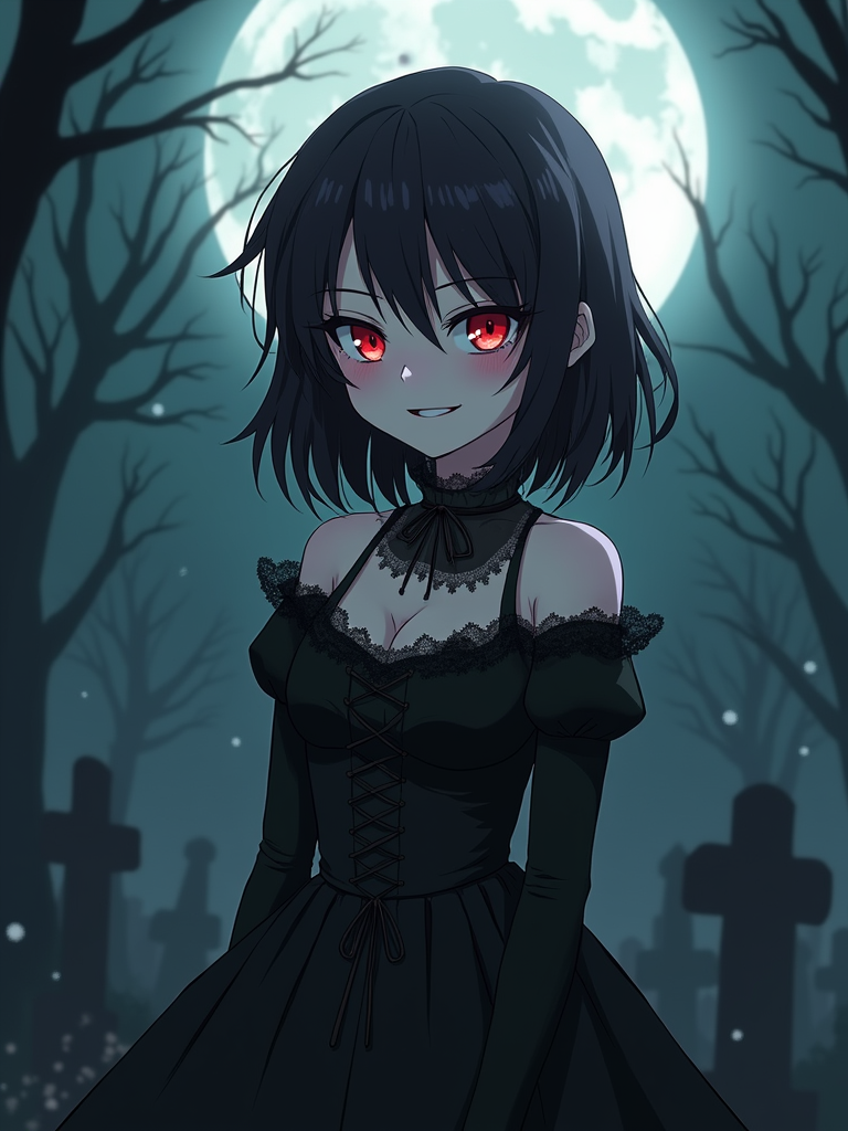 A gothic anime vampire avatar, with pale skin and piercing red eyes, wearing a Victorian-style dress with lace details and a mysterious smile . The setting is a foggy moonlit graveyard. the style is in anime illustration.