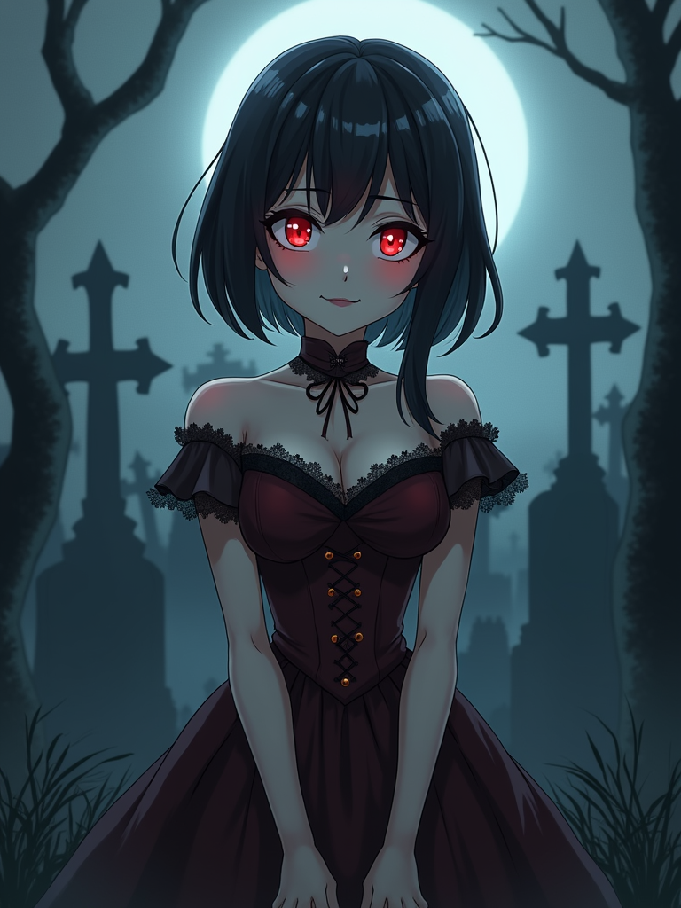 A gothic anime vampire avatar, with pale skin and piercing red eyes, wearing a Victorian-style dress with lace details and a mysterious smile . The setting is a foggy moonlit graveyard. the style is in anime illustration.