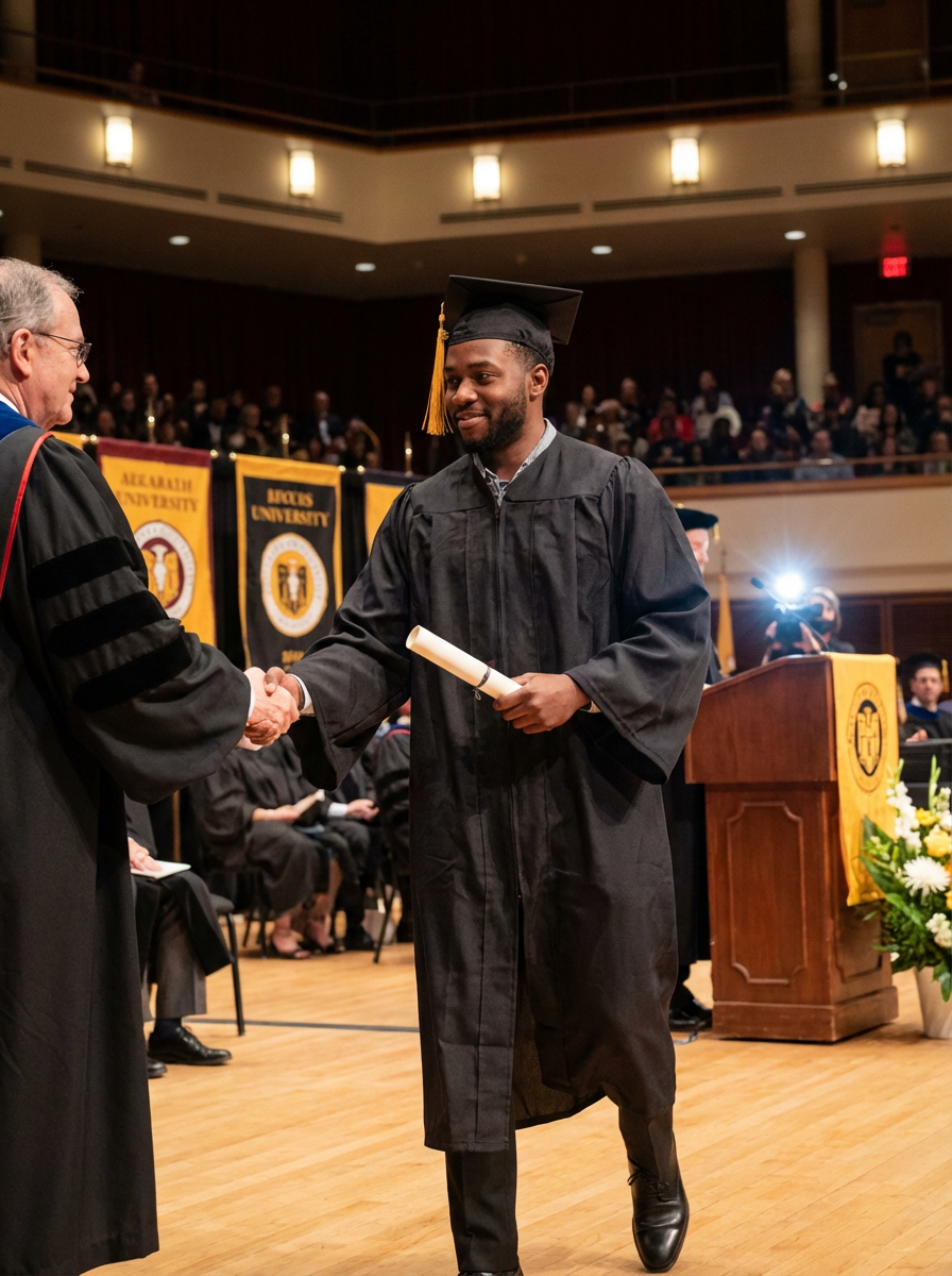 a graduate model in their academic gown at stage to receive their diploma