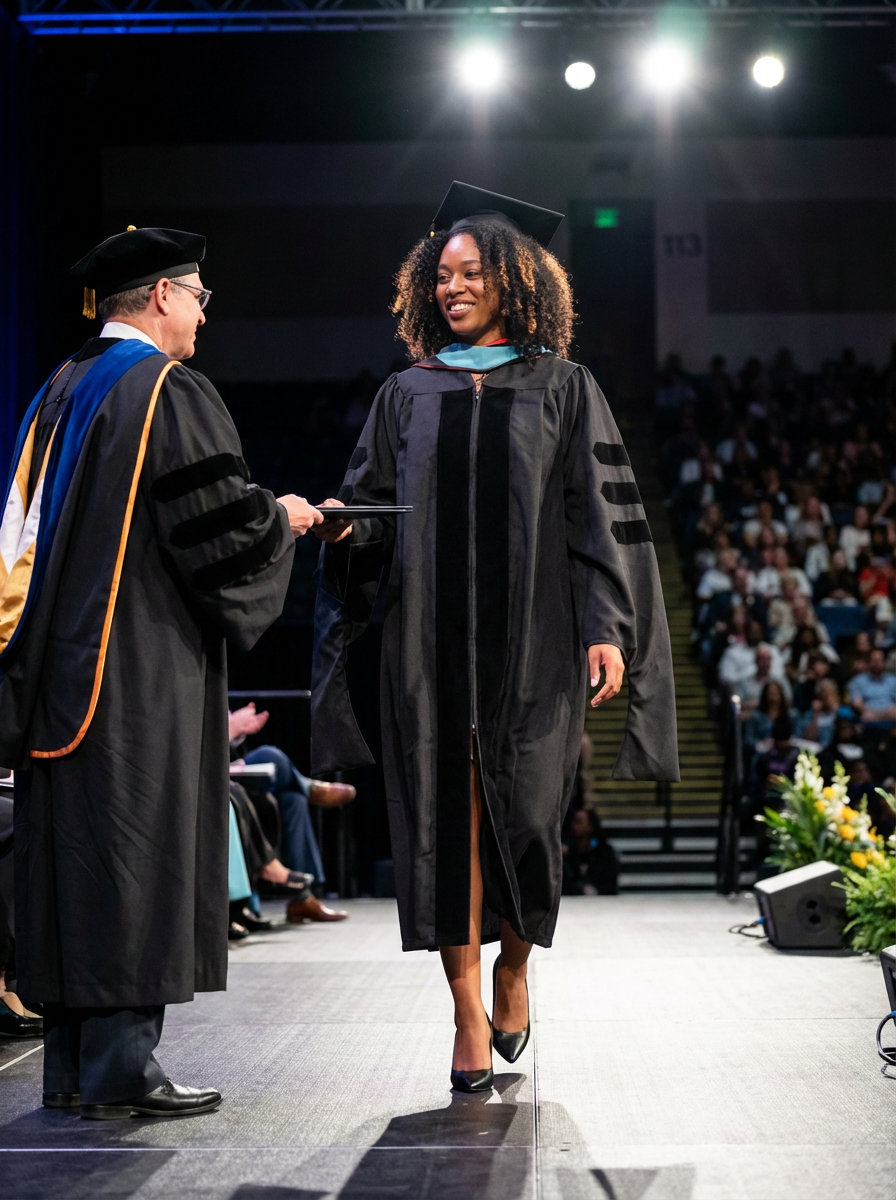 a graduate model in their academic gown at stage to receive their diploma