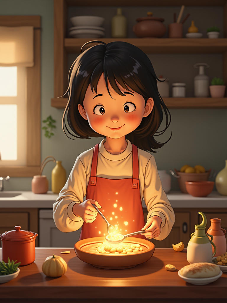 A heartwarming line art anime-inspired portrait in a cozy kitchen, wearing comfortable home clothes, cooking magical food that glows and floats. The kitchen is filled with animated cooking tools and helpful spirits. The style is warm like a line art anime film.