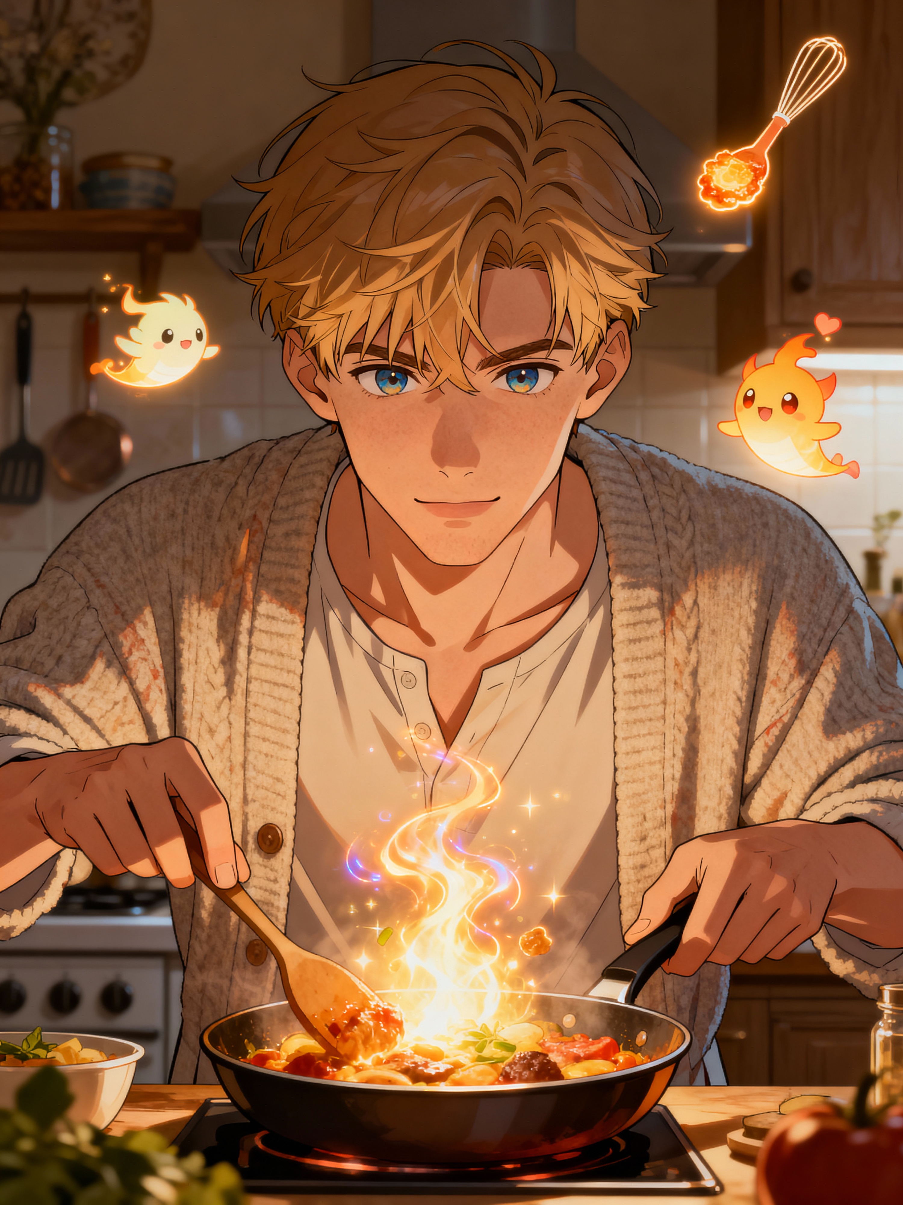 A heartwarming line art anime portrait in a cozy kitchen, with model wearing comfortable home clothes, cooking magical food that glows and floats. The kitchen is filled with animated cooking tools and helpful spirits. The style is warm.