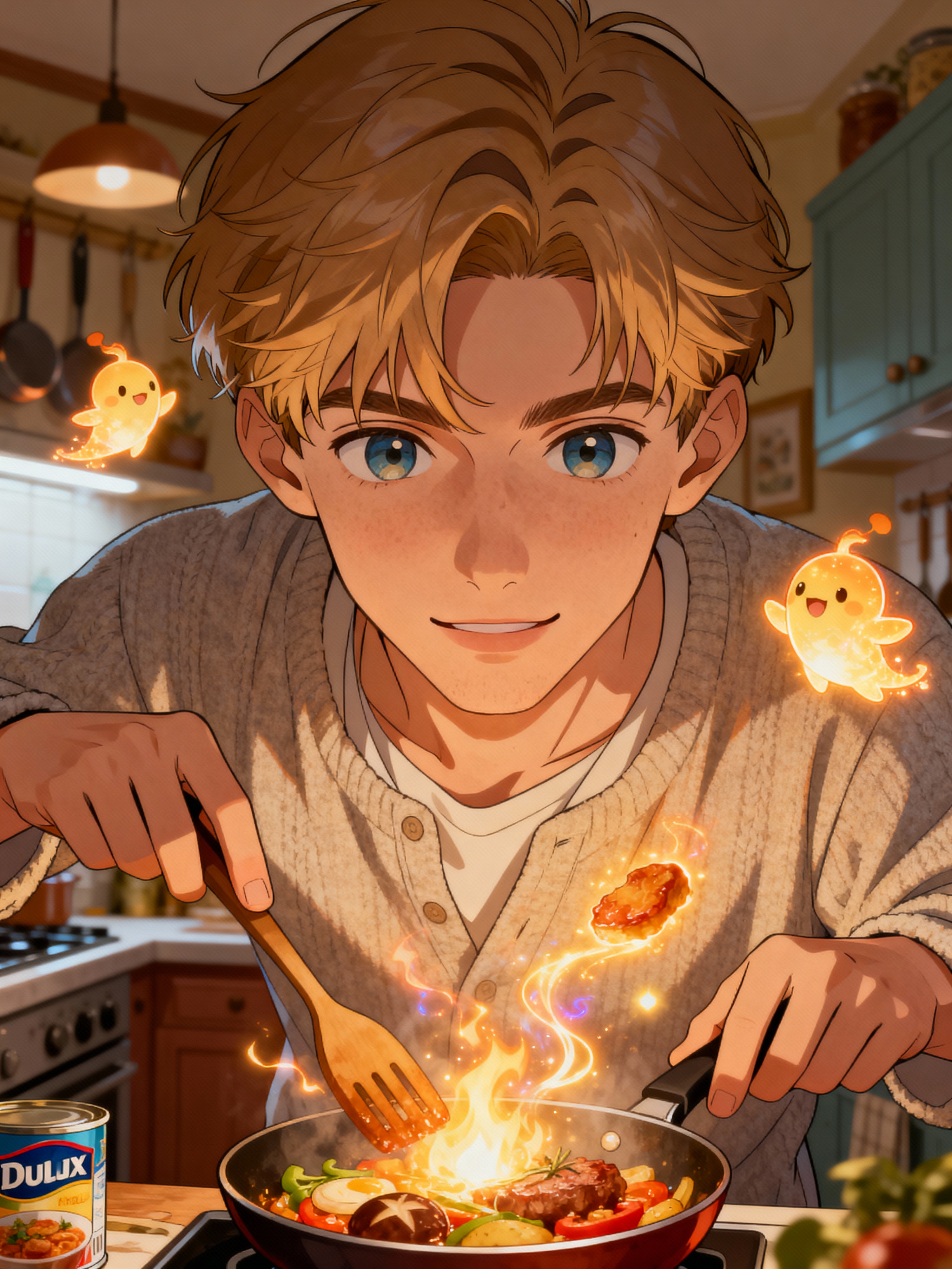 A heartwarming line art anime portrait in a cozy kitchen, with model wearing comfortable home clothes, cooking magical food that glows and floats. The kitchen is filled with animated cooking tools and helpful spirits. The style is warm.