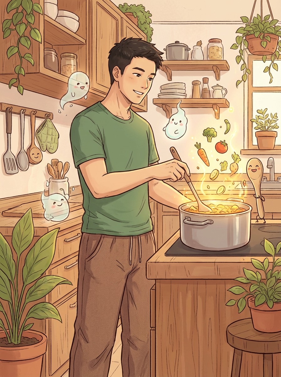 A heartwarming line art anime portrait in a cozy kitchen, with model wearing comfortable home clothes, cooking magical food that glows and floats. The kitchen is filled with animated cooking tools and helpful spirits. The style is warm.