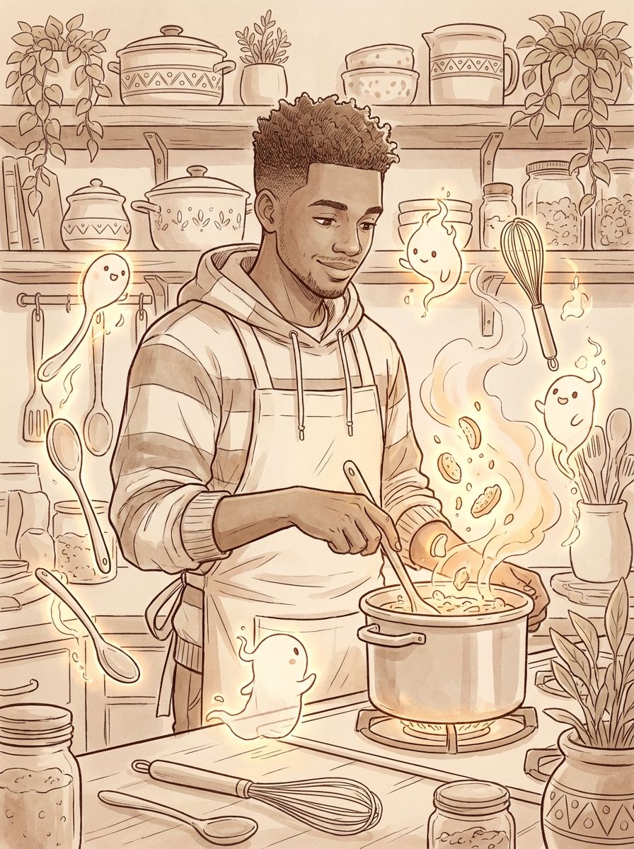 A heartwarming line art anime portrait in a cozy kitchen, with model wearing comfortable home clothes, cooking magical food that glows and floats. The kitchen is filled with animated cooking tools and helpful spirits. The style is warm.