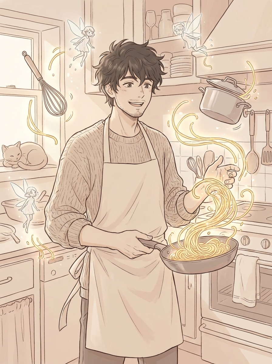 A heartwarming line art anime portrait in a cozy kitchen, with model wearing comfortable home clothes, cooking magical food that glows and floats. The kitchen is filled with animated cooking tools and helpful spirits. The style is warm.